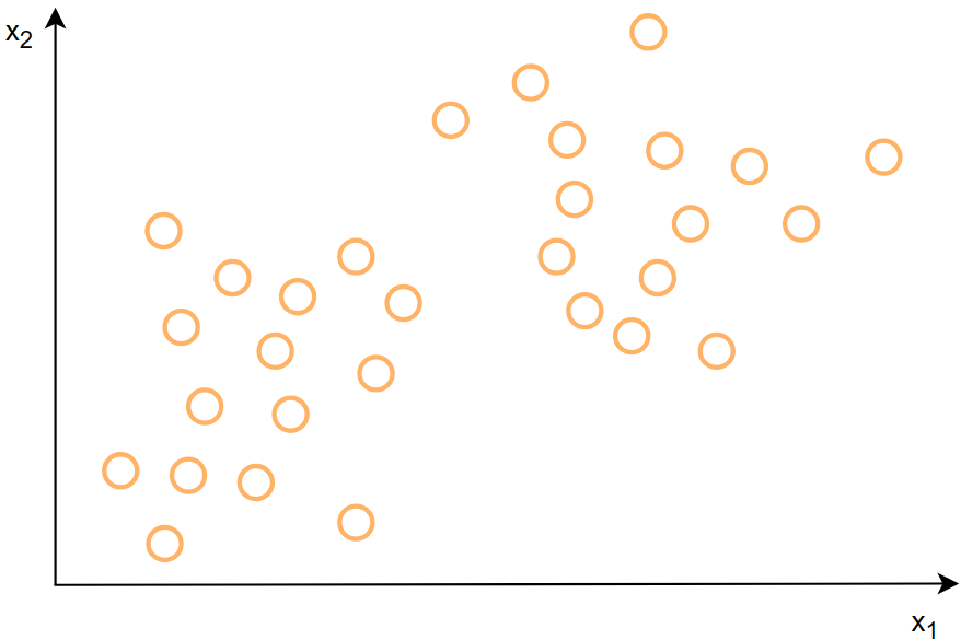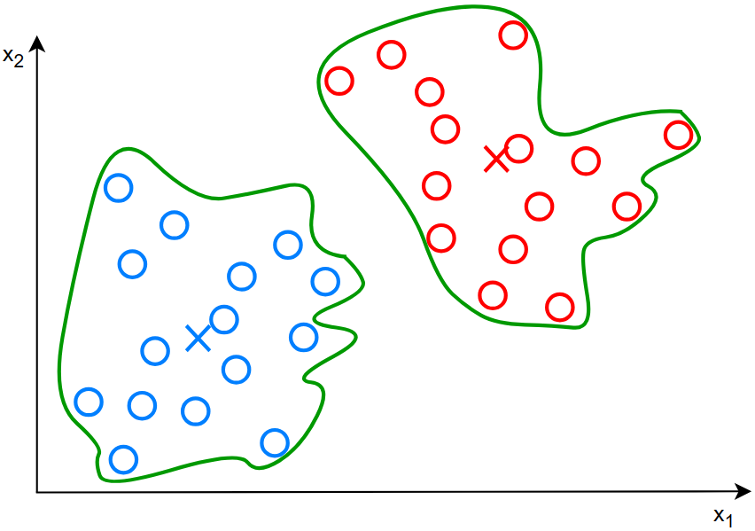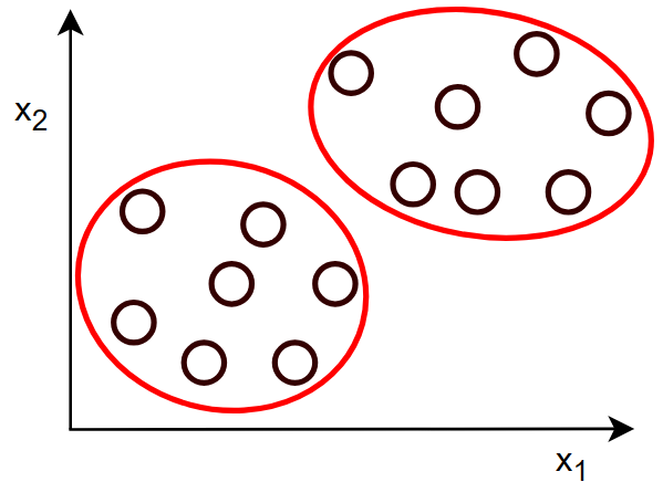 目标是找出数据中的一些有趣的东西或者规律,像图中的就是将两簇数据聚为两类,也就是聚类