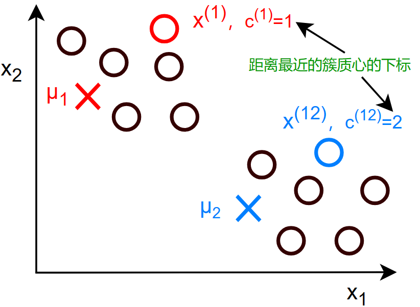 \(c^{(i)}\) = 距离 \(x^{(i)}\) 最近的簇质心的下标