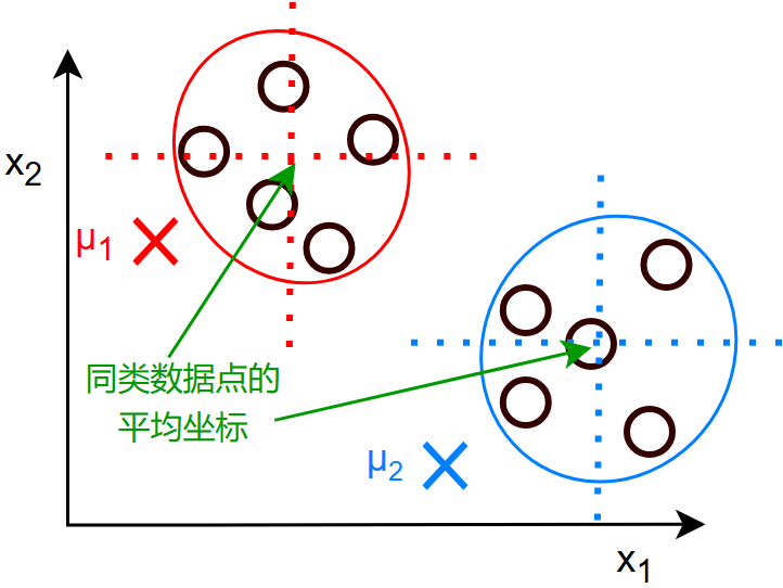 - 例如:\(\mu_1=\frac{1}{4}(x^{(1)}+x^{(5)}+x^{(6)}+x^{(10)})\) 其中的 \(x\) 都是含有两个数 \((x_1,x_2)\) 的向量