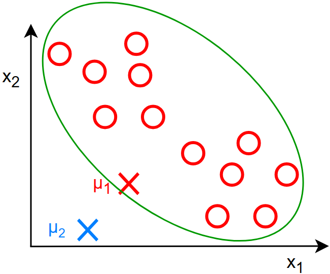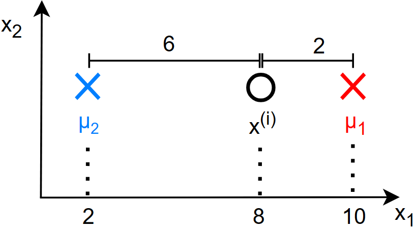 根据上图,\(\mu_1\) 到 \(x^{(i)}\) 的距离是更短的,所以损失函数会选择 \(\mu_1\) ,在函数中体现为: