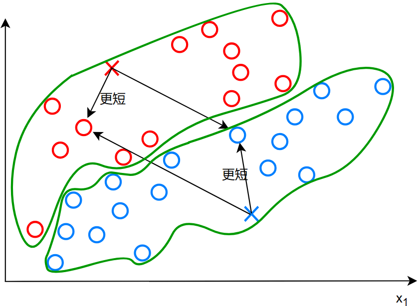 怎么找到他们各自的同伴呢,正所谓“远乡不如近邻”,我们可以看看这些点,哪些离他们近就把近的点归为他们的同类