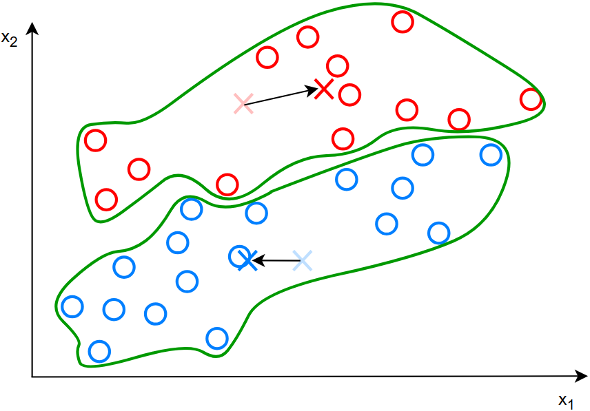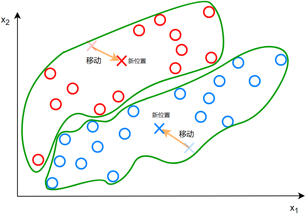 标记好同类之后,两个簇质心继续向着各自同类的质心移动: