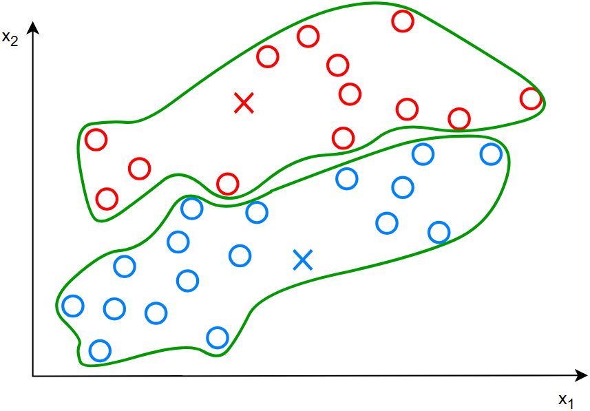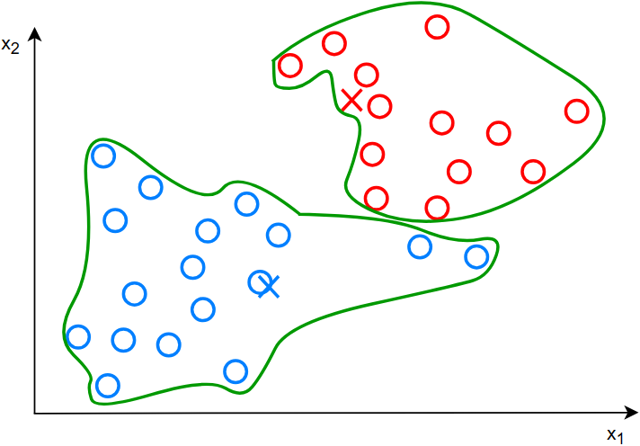 上图是一堆数据的分布,怎么将左下和右上两类数据进行聚类呢