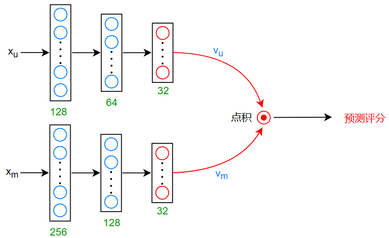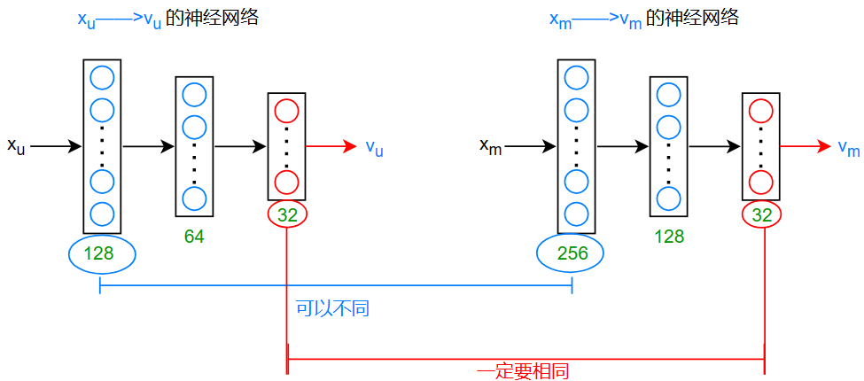 那么,怎么将两个尺寸不相同的向量 \(x_u^{(j)},x_m^{(i)}\) 转化为尺寸相同的向量 \(v_u,v_m\) 呢?