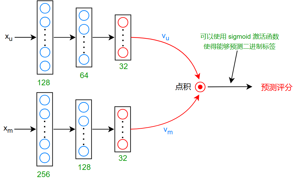 为了将两个尺寸不相同的向量 \(x_u^{(j)},x_m^{(i)}\) 转化为尺寸相同的向量 \(v_u,v_m\) ,深度学习是一个好的选择