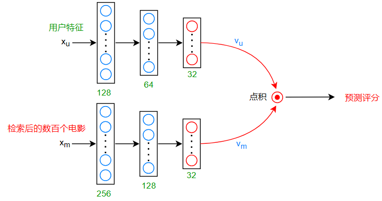 当然,就像之前提到的,如果你在夜晚就已经将所有的电影的特征计算好了,那么在输入神经网络的时候,就只需要执行用户特征的计算即可
