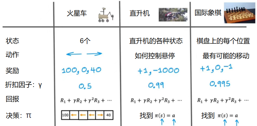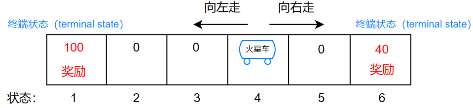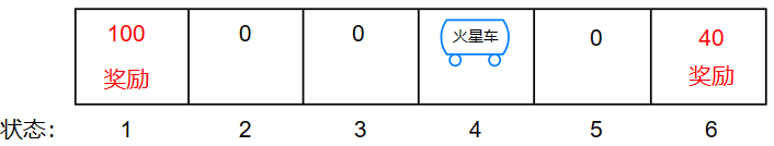 我们定义一个状态函数来描绘火星车的状态、奖励、下一步的动作等: \[ (s,a,R(s),s') \]