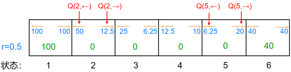 则 \(Q(2,\rightarrow)=0+(0.5)\times0+(0.5)^2\times0+(0.5)^3\times100=12.5\)
