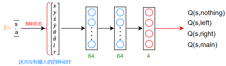 这次我们输入的只有状态 \(s\) ,且直接输出当前状态做出四种动作的Q函数的值