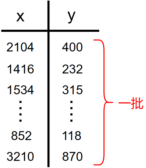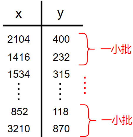 并且参数更新公式中的 \(m\) 全部替换为 \(m'\) : \[ \begin{gather} w=w-lr\cdot \frac{\partial}{\partial w}\frac{1}{2m'}\sum_{i=1}^{m'}(f_{w,b}(x^{(i)})-y^{(i)})^2 \\ b=b-lr\cdot \frac{\partial}{\partial b}\frac{1}{2m'}\sum_{i=1}^{m'}(f_{w,b}(x^{(i)})-y^{(i)})^2 \end{gather} \] 但是小批量有一个缺点: