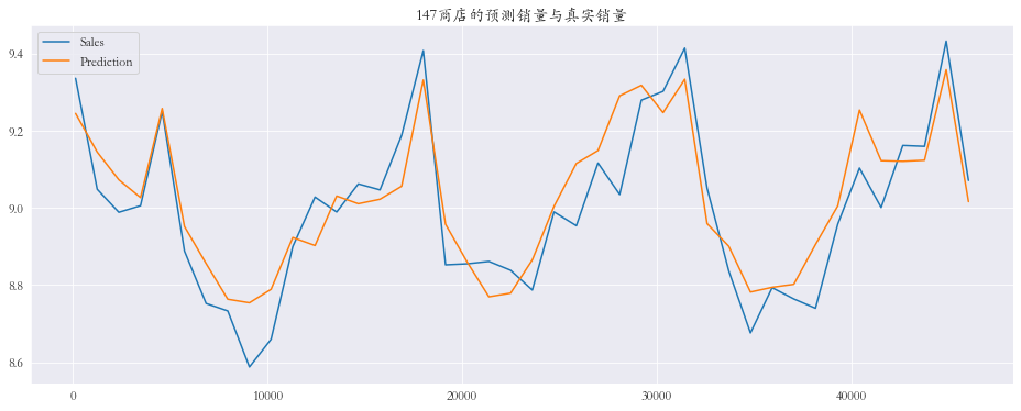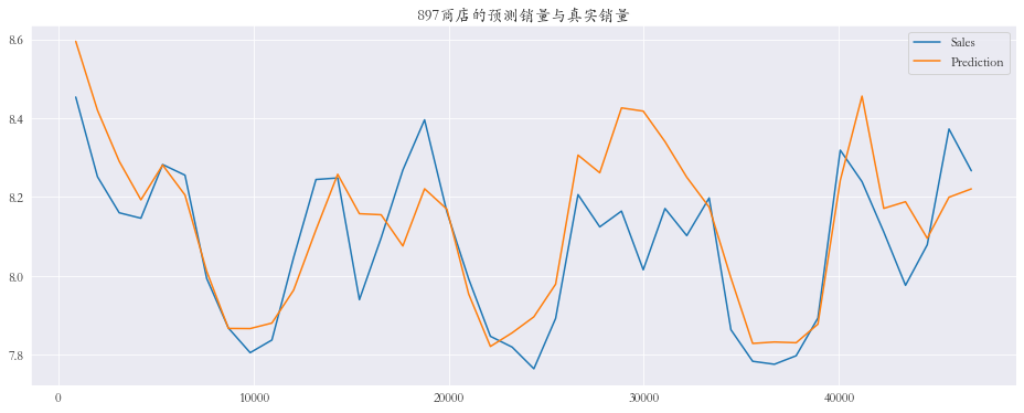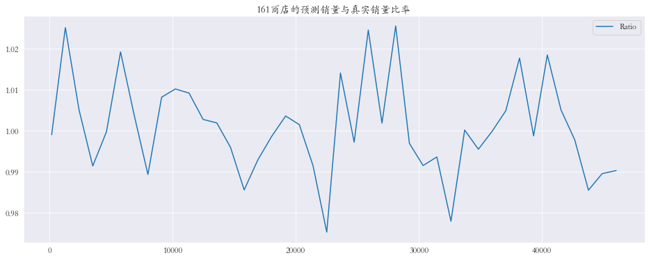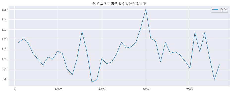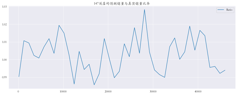 1 2 3 4 5 6 7 8 9 10 11 12 13 14 15 plt.rcParams['font.family' ] = 'STKaiti' col_1 = ['Sales' , 'Prediction' ] col_2 = ['Ratio' ] shops = np.random.randint(1 , 1116 , size=3 ) print ('所有商店的预测值和真实销量的比率%.3f' % res['Ratio' ].mean())print ('所有商店的预测值和真实销量的比率%.3f' % res['Ratio' ].mean())for shop in shops: data_col_1 = res[res['Store' ] == shop][col_1] data_col_2 = res[res['Store' ] == shop][col_2] data_col_1.plot(title=f'{shop} 商店的预测销量与真实销量' , figsize=(16 , 6 )) data_col_2.plot(title=f'{shop} 商店的预测销量与真实销量比率' , figsize=(16 , 6 ))