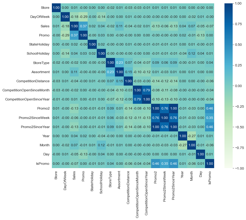1 2 3 plt.figure(figsize=(12 , 10 )) plt.rcParams['font.size' ] = 12 sns.heatmap(df_train.corr(), annot=True , cmap='GnBu' , fmt='.2f' , vmin=-1 , vmax=1 )