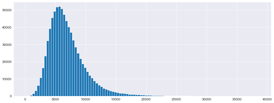 1 2 plt.figure(figsize=(16 , 6 )) _ = plt.hist(X_train['Sales' ], bins=100 )