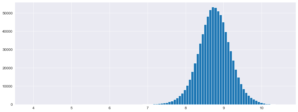 1 2 3 4 5 6 7 8 y_train = np.log1p(X_train['Sales' ]) y_test = np.log1p(X_test['Sales' ]) X_train = X_train.drop(['Sales' ], axis=1 ) X_test = X_test.drop(['Sales' ], axis=1 ) plt.figure(figsize=(16 , 6 )) _ = plt.hist(y_train, bins=100 )