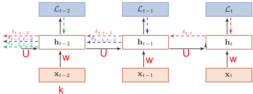 对于 \(\delta_{t,k}\) : \[ \begin{gather} \delta_{t,k}=\frac{\partial L_t}{\partial z_k} \\ =\frac{\partial h_k}{\partial z_k}·\frac{\partial z_{k+1}}{\partial h_k}·\frac{\partial L_t}{\partial z_{k+1}} \\ =diag(f'(z_k))·U^T·\delta_{t,k+1} \end{gather} \] 这就是随时间反向传播算法(BPTT)