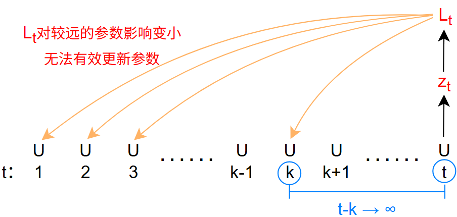 注意: 其中的梯度并没有完全消失,只是里 \(L_t\) 越远,梯度越异常 \[ \begin{gather} \frac{\partial L_t}{\partial U}\rightarrow0/\infty\qquad t-k\rightarrow\infty\qquad \times \\ \\ \frac{\partial L_t}{\partial U^k}\rightarrow0/\infty\qquad t-k\rightarrow\infty\qquad\checkmark \end{gather} \] 长程依赖问题: 由于梯度爆炸/消失,实际上只能学习到短周期的依赖关系