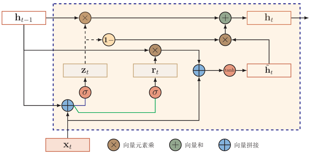 h_t=z_t\odot h_{t-1}+(1-z_t)·tanh(W_h·x_t+U_h·(r_t\odot h_{t-1})+b_h) \\