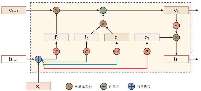 所以,LSTM的门控和输出为: \[ \begin{cases} c_t=f_t\odot c_{t-1}+i_t\odot \hat{c_t} \\ h_t=o_t\odot tanh(c_t) \\ f_t=\sigma(W_fx_t+U_fh_{t-1}+b_f) \\ i_t=\sigma(W_ix_t+U_ih_{t-1}+b_i) \\ o_t=\sigma(W_ox_t+U_oh_{t-1}+b_o) \\ f_t,i_t,o_t\in(0,1)^d \end{cases} \] LSTM的循环单元结构:
