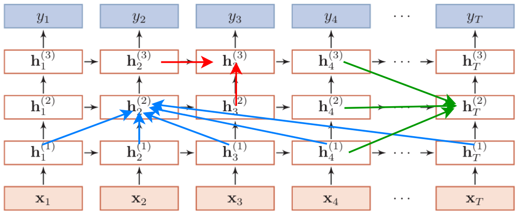 - 来自于下一层的所有时刻信息(图中蓝色箭头)