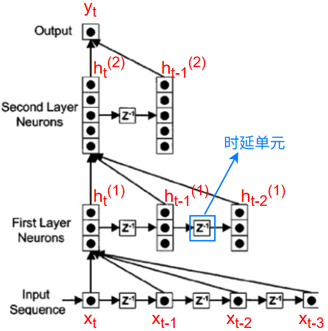 在第 \(t\) 个时刻,第 \(l\) 层神经元和第 \(l-1\) 层神经元的最近 \(k\) 次输出相关,即: \[ h_t^l=f(h_t^{l-1},h_{t-1}^{l-1},h_{t-2}^{l-1},...,h_{t-k+1}^{l-1}) \] 这样,前馈神经网络就具有了短期记忆能力: