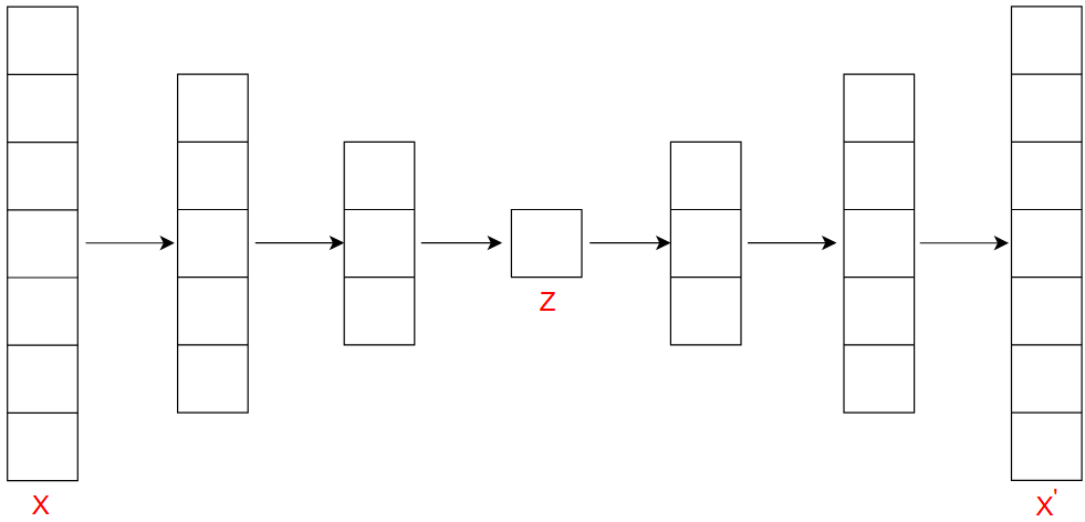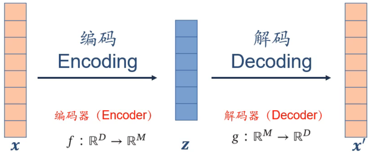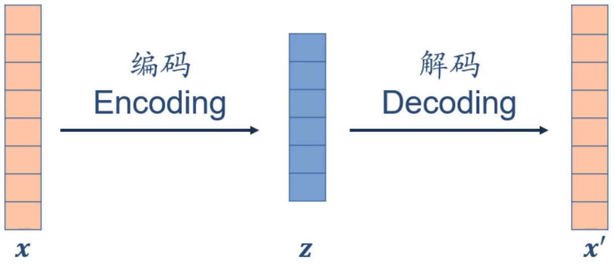 例如图中,将 \(x\) 以某种编码方式,映射到另一个空间中的 \(z\) ,其又称作 \(x\) 的编码,还可以将 \(z\) 解码回原来的 \(x'\)