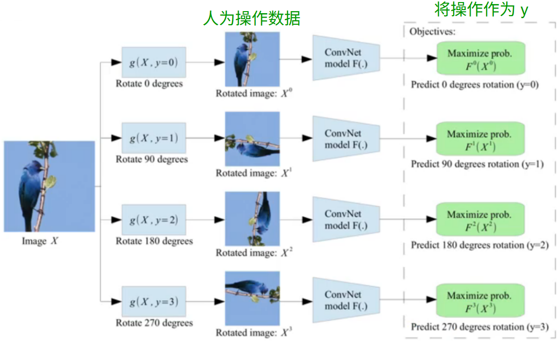 人为对数据进行操作或加噪,并将这些操作作为 \(y\) 给网络学习