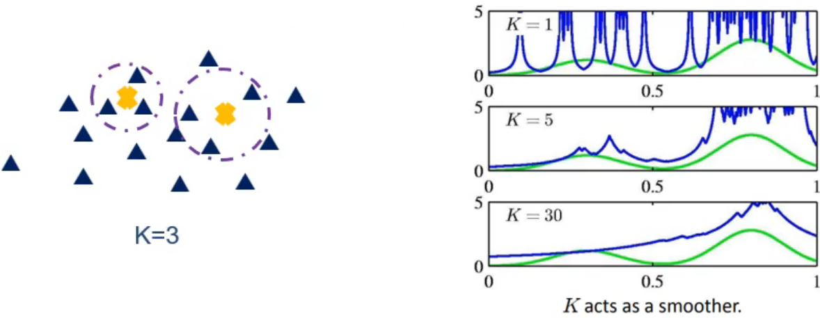 改变区域大小以使得落入每个区域的样本数量为 \(K\) ,这种方式称为 \(K\) 近邻方法