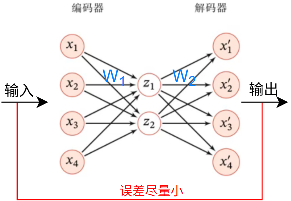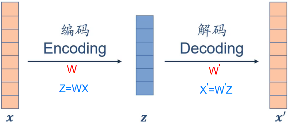 在上图中,\(X\) 通过编码 \(Z=WX\) 得到 \(Z\) ,而 \(Z\) 通过解码 \(X^{'}=W^{'}Z\) 还原得到 \(X^{'}\)