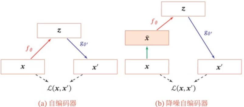 然后将被损坏的向量 \(\tilde{x}\) 输入给自编码器得到编码 \(Z\) ,并重构出原始的无损输入 \(X\)